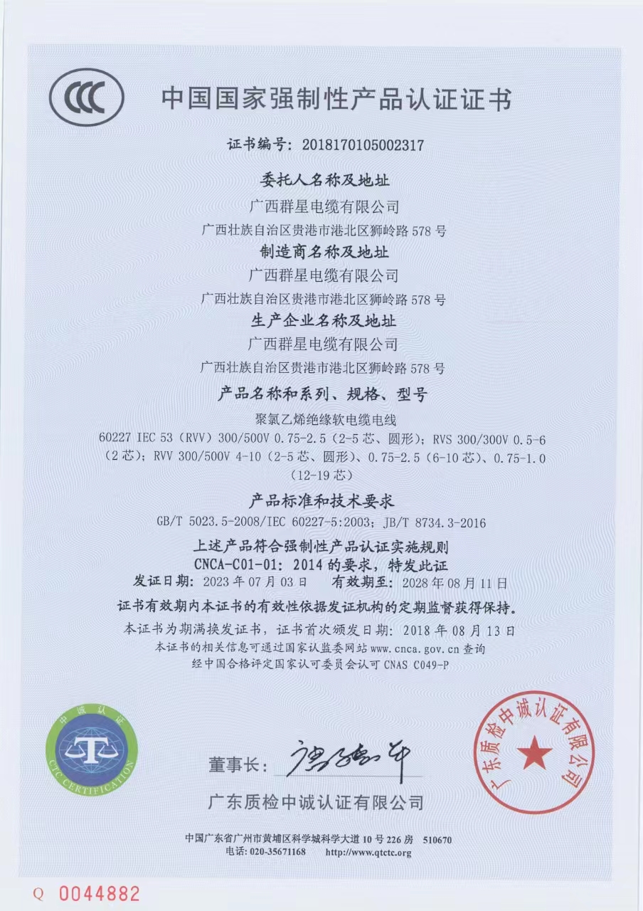 首頁 > 關于我們 >質量認證 >聚氯乙烯絕緣軟電纜電線3C認證RVV RVS